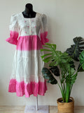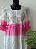 Expertly crafted with pure cotton, this white gown features delicate hand embroidery on the neckline and puffed sleeves. The beautiful pink shading adds a touch of femininity, while the attached lining ensures comfort and elegance. A perfect choice for any special occasion.