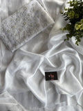 Elegantly shimmer in this gorgeous white georgette saree with a shimmering sequin blouse. Perfect for special occasions, this saree adds a touch of sparkle to your ensemble. Embrace the beauty and grace of this saree and stand out from the crowd.