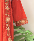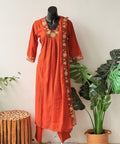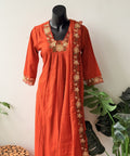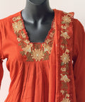 Emb neck A line kurta, elastic waist santoon pant comes with border work soft cotton dupatta