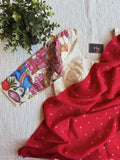 Size 38 - 3/4th sleeve pichwai work padded blouse comes with tomato red weaving crepe silk saree