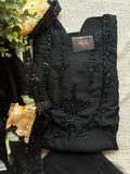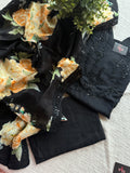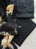Black sequins work semi stitched muslin top, plain santoon bottom comes with floral printed taby silk dupatta with sequins border work