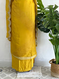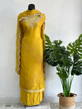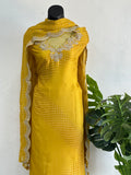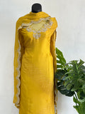 Partywear beautiful Neck work printed Russian silk top, plain santoon bottom comes with scallop emb printed organza silk dupatta