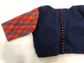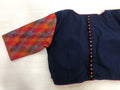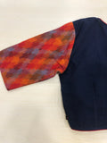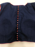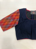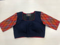 Naby blue piping padded blouse with colourful premium double ikat elbow sleeves comes with back potli and back open