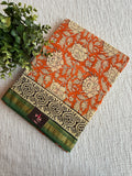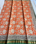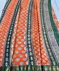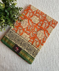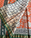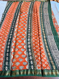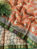 Hand Block Printed Pure Chanderi saree comes with golden zari maheswari border with printed pallu and running blouse pc