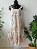Elevate your wardrobe with this multi-striped cotton layered gown, designed for effortless elegance. Crafted from breathable cotton, its layered silhouette adds depth and movement, while the subtle stripes bring a refined visual interest. Perfect for occasions where comfort meets sophistication, this gown offers a graceful fit that complements your style with understated charm.