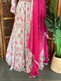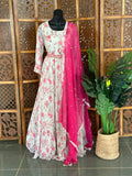 Size 40-42 Neck sequins embroidery padded Floral printed ready maxi gown with hip belt , comes with plain chiffon dupatta and matching legging