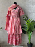 Light pink printed cotton short kurti, elastic waist printed sharara pant comes with printed cotton dupatta