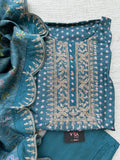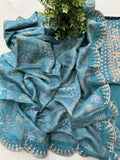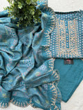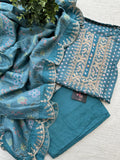 Neck embroidery printed Dola silk top, plain santoon bottom comes with kantha printed dola silk dupatta with zari weaving scallop border