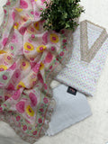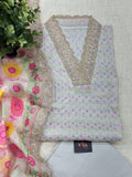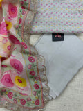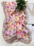 Enliven your wardrobe with this beautiful printed organza suit material. Crafted from luxurious soft organza, this top oozes elegance with its pretty neck work and charming floral print. Accented with a scallop embroidered border and plain santoon bottom, it is completed with a printed pure organza dupatta to enhance its refined appeal. A must-have for any fashionable woman.