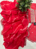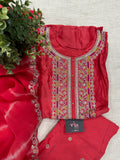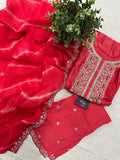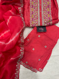 This elegant Readymade Dola silk kurta pant set is perfect for special occasions. The top features intricate neck embroidery and is crafted from luxurious Dola Silk. The elastic waist pant is similarly detailed with gorgeous embroidery work. The set is complete with a striking Shibori printed organza dupatta with beautiful embroidered border for added texture and definition.