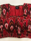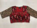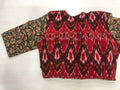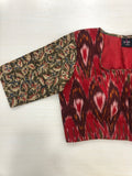 Red ikat padded blouse with kalamkari sleeves, Front open elbow sleeves blouse