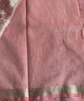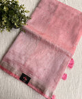 The silver zari tissue saree is crafted with intricate weaving and showcases an embroidered pallu, accompanied by a matching blouse piece for an elegant ensemble.