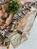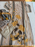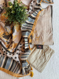 V neck cream colour striped and floral printed silk cotton top, elastic waist pure cotton pant comes with printed silk cotton dupatta.