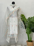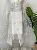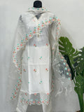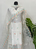 V neck design embroidery organza top, elastic waist cotton bottom comes with emb organza dupatta