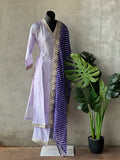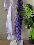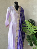Collared V Neck embroidery work Russian silk kurti, elastic waist plain santoon bottom comes with Shibori printed organza dupatta with gotta patti border